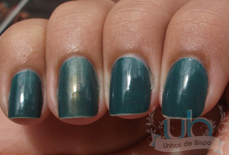 O 784 é um esmalte verde escuro com microbrilhos dourados… Um charme!