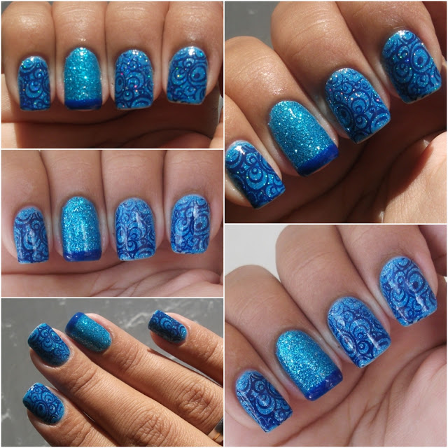 Lembram da unha glitter do Desafio? Então, aproveitei para brincar com ela e carimbei com a placa m65 da Konad e esmalte azul pra carimbo da Hits, já no anelar fiz uma francesinha com o Celeste da Mohda.