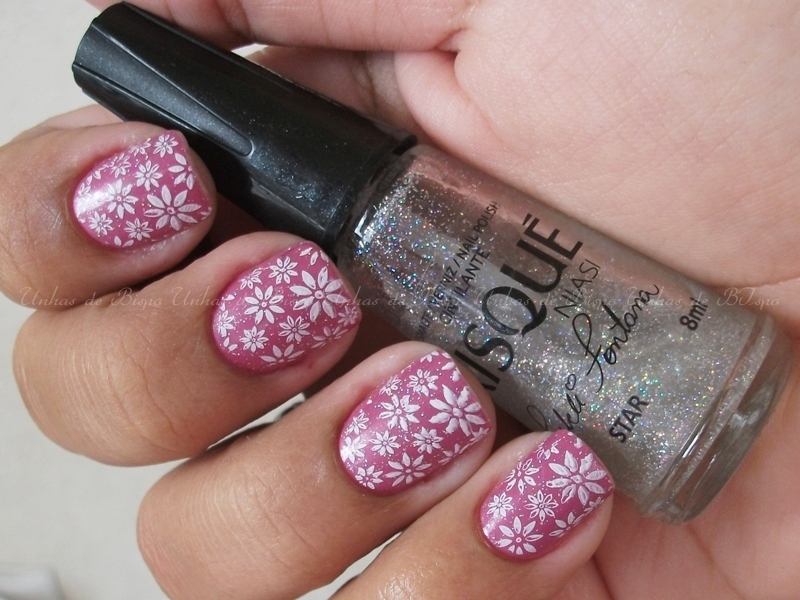 Passei uma camada do Star da Risqué porque queria um brilho discreto e ele é perfeito nisso! Depois carimbei com o Branco para carimbo da Blant Colors… Estou amando os esmaltes para carimbo da Blant, são perfeitos demais!!!