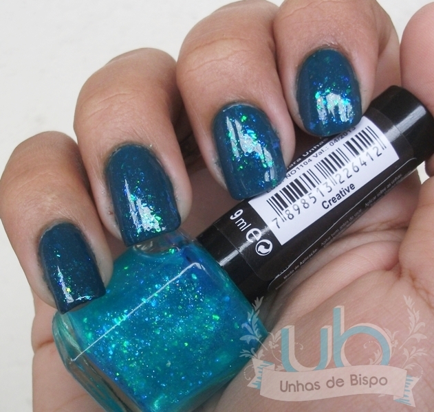 Duas camadas do Creative, secagem rápida. Justamente por ter flocos em tamanhos diferentes, alguns flocos parecem pontinhos de glitter, o que deixa o efeito ainda mais bonito!