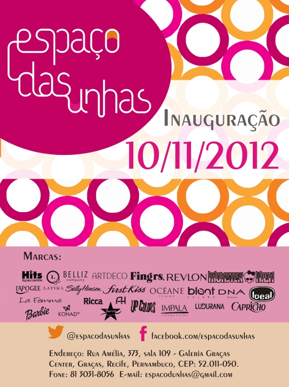 O Espaço das Unhas irá funcionar na Galeria Graças Center, localizada na Rua Amélia, 373, sala 109, a partir do dia 10 de novembro. Eu estarei lá, e vocês?