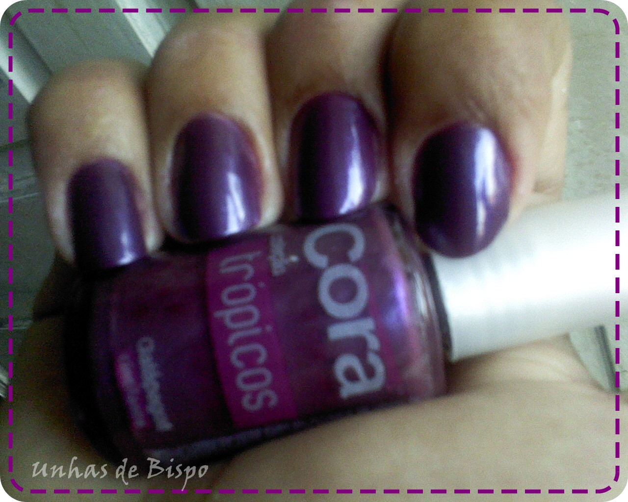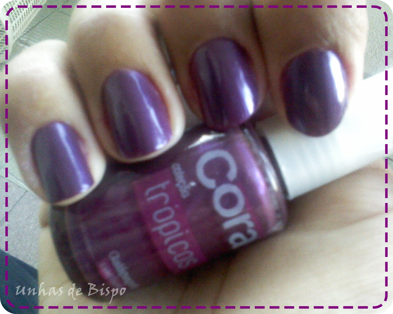 Ele é um roxo com fundo rosado, lindo demais! Precisei de três camadas para cobrir toda a unha perfeitamente, mas é super fácil de passar e principalmente de limpar.