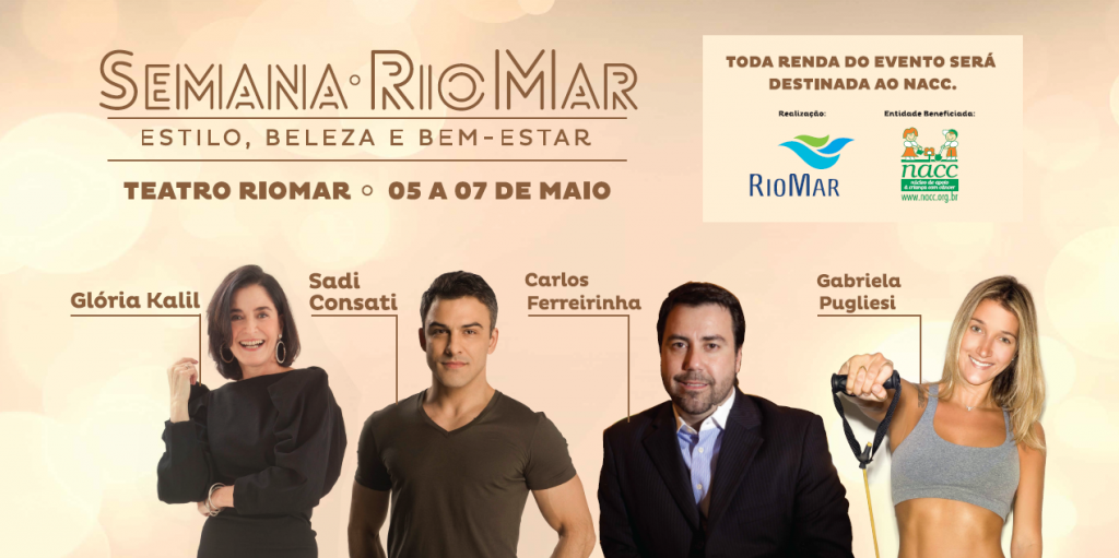Dicas, tendência e conteúdo de qualidade são apenas alguns dos ingredientes que farão a Semana de Estilo, Beleza e Bem-estar, evento sobre lifestyle que o RioMar anuncia para os dias 5, 6 e 7 de maio com palestras de personalidades como Glória Kalil, Gabriela Pugliesi, Carlos Ferreirinha, Sadi Consati, e os renomados médicos Luciano Teixeira, Carlos Homero e Luciana Rocha. Os ingressos terão um valor simbólico e a renda será toda doada ao NACC. Durante três dias, o Teatro RioMar será o ponto de encontro daqueles que não perdem a oportunidade de estar por dentro das novidades e tendências nos segmentos da moda, comportamento, saúde, estética, fitness, mercado de luxo, tendo a cada dia, dois grandes nomes dos cenários nacional e local.