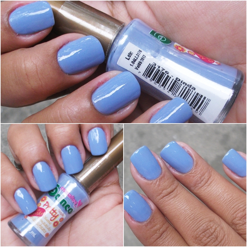 Dinda: azul de fundo cinza, doido pra ser lilás. Outro que eu adorei mesmo precisando de quatro camadas. É uma prova de paciência passar tantas camadas, mas pra limpar e remover ele não incomodou.