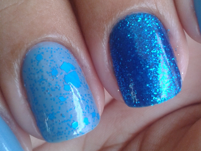 Eu passei uma camada do Doce Oceano nas unhas que receberiam glitter e duas camadas nas demais, em seguida passei duas camadas do Azul Cristalino e duas camadas do Your Song. Finalizei tudo com duas camadas do Verniz Estra Brilho da Impala, que é muito bom para uniformizar glitter.