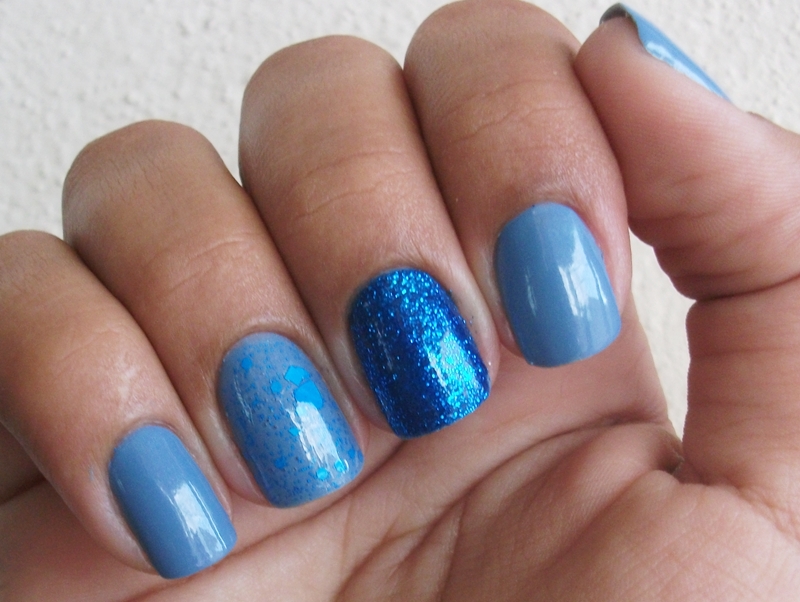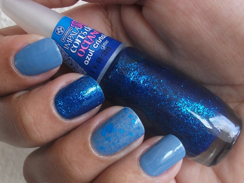 Depois de ficar um tempão indecisa, optei por uma combinação que me permitiu usar três tipos de tons e acabamentos. Os escolhidos foram o Doce Oceano da Impala, o Azul Cristalino também da Impala e o Your Song da BBF.