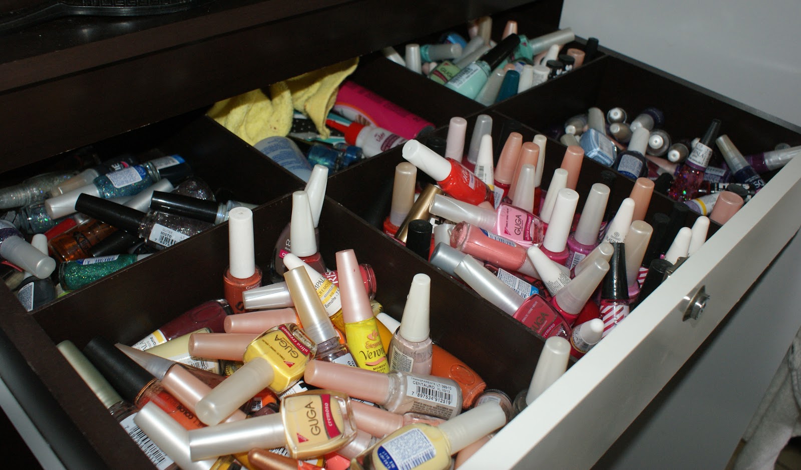 Fiquei até curiosa pra saber quantos esmaltes eu tenho…..só sei que eles são guardados espalhados pela casa. Tem na gaveta, no móvel do quarto, numa maletinha de manicure, na bolsa…rsrsrs